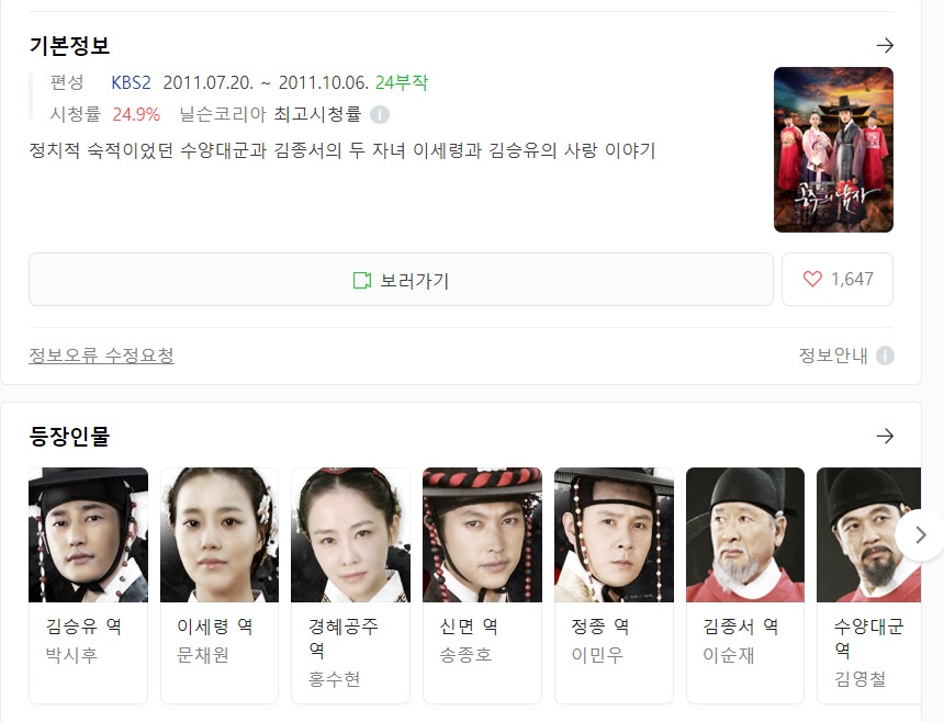 이 드라마의 주인공은 김종서의 아들 김승유(박시후)와 세조의 딸 이세령(문채원) 이다. 그러나 역사적으로 김종서의 아들은 세조가 왕위를 찬탈하는 과정에서 사망하였으므로 이 드라마의 김승유는 가상의 인물이다. 드라마의 주인공들이니 이들의 이야기가 주를 이루고 있다.